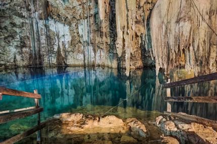 Es un impresionante cenote tipo caverna con aguas cristalinas en tonos azules, ubicado en Homún cerca del Cenote Maní Chan